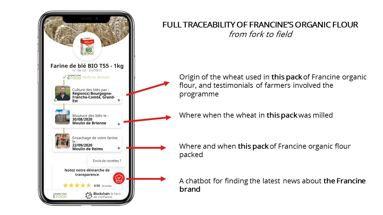 “Blockchain technology guarantees the verifiability and inalterability of data. It means that our organic flour can be traced batch by batch, detailing the journey from grain to finish product. It also enables us to promote our claim of 100% French organic wheat and to highlight the commitment of our partner-growers through video testimonials. Another advantage is that the web app gives consumers access to the Francine world and, thanks to a chatbot, a wide variety of recipe ideas!” explains Claire Madoré, Director of Marketing & E-business and Retail Commercial Director for Grands Moulins de Paris.