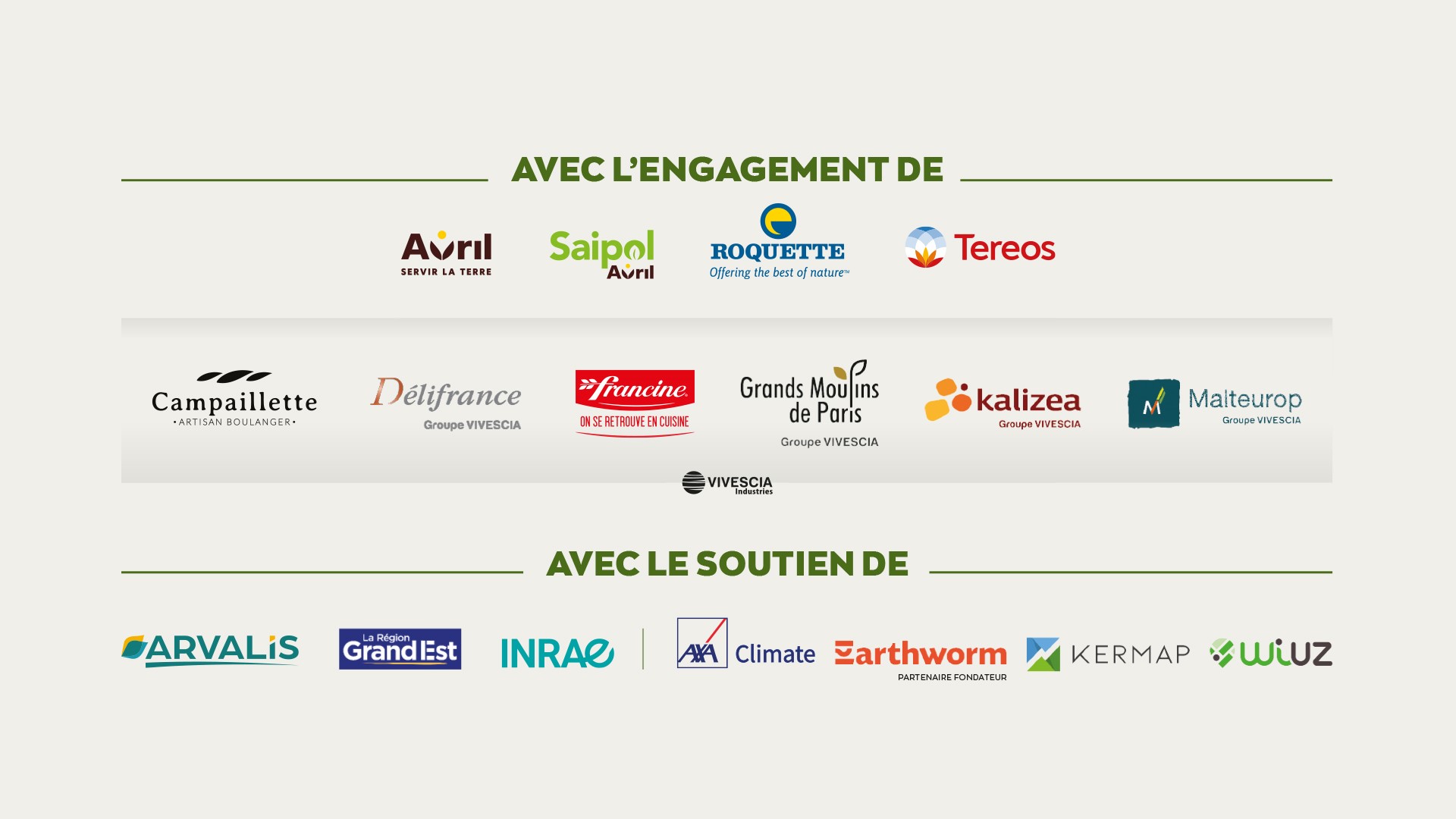 low carbon and coordinator of the VIVESCIA upstream agricultural program, Véronique Fontaine-Heim, Executive Director of the VIVESCIA Cooperative, Bastien Sachet, CEO Earthworm, Philippe Mauguin, President of INRAE, Christoph Büren, President of VIVESCIA, Sébastien Bernier, Director of Agricultural Sourcing Groupe Roquette, Emmanuel Manichon, Chief Executive Officer Avril-Saipol, Olivier Miaux, Managing Director of VIVESCIA Industries, Olivier Hautin, Managing Director of Malteurop, Valérie Frapier, VIVESCIA Group CSR Director, Robert O'Boyle, CEO of Délifrance, Pierre Garcia, CEO of Grands Moulins de Paris